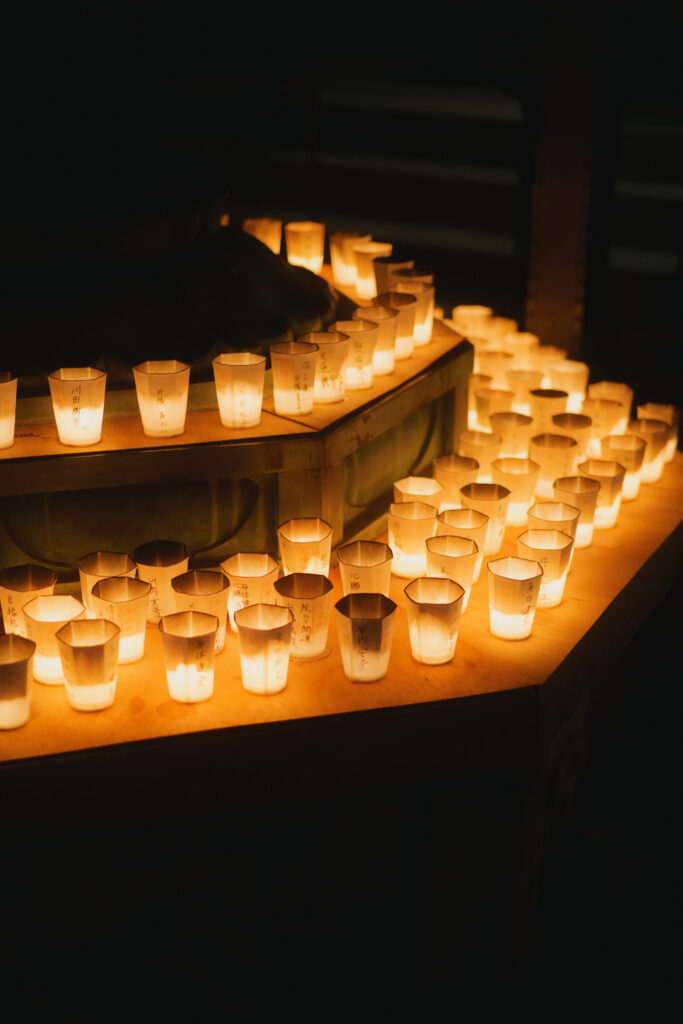光の粒が優しく拡散することで、灯火の光芒と献燈の台座の質感が際立ち、神秘的な空間が広がっています。炎の揺らめきが生み出す温かなグラデーションに、万灯の静謐な力を込めました。