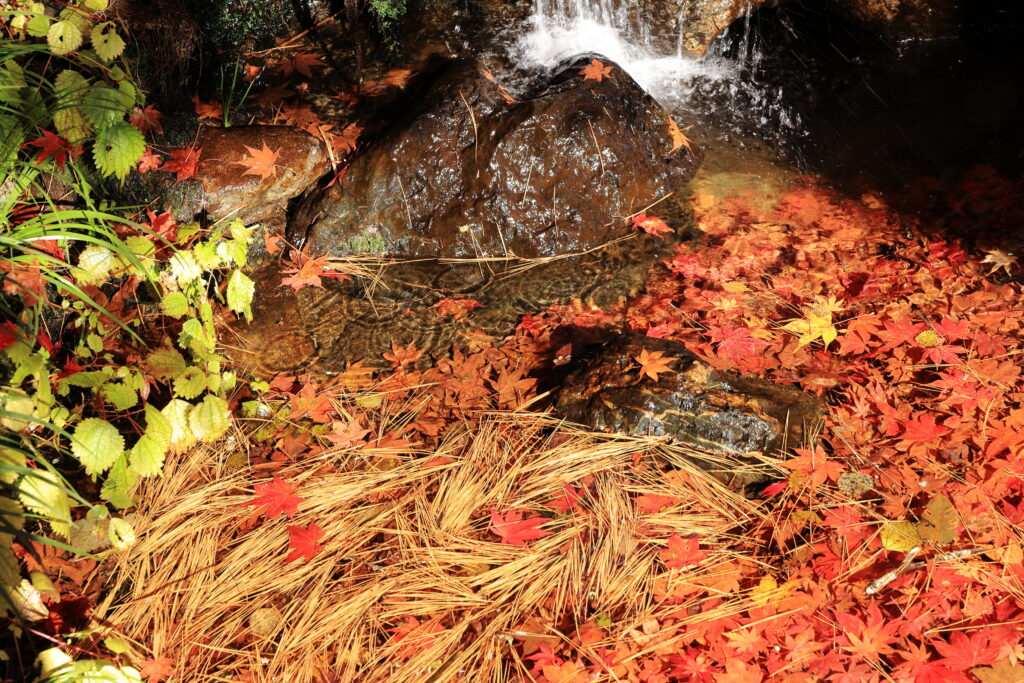 栃木県の古峯園の入口手前の小さな滝から流れ落ちる池で撮影しました。紅葉とささに光が射し、C-PLフィルターで反射を調整して、撮りました。心が癒される場所にめぐり会え感動しました。
