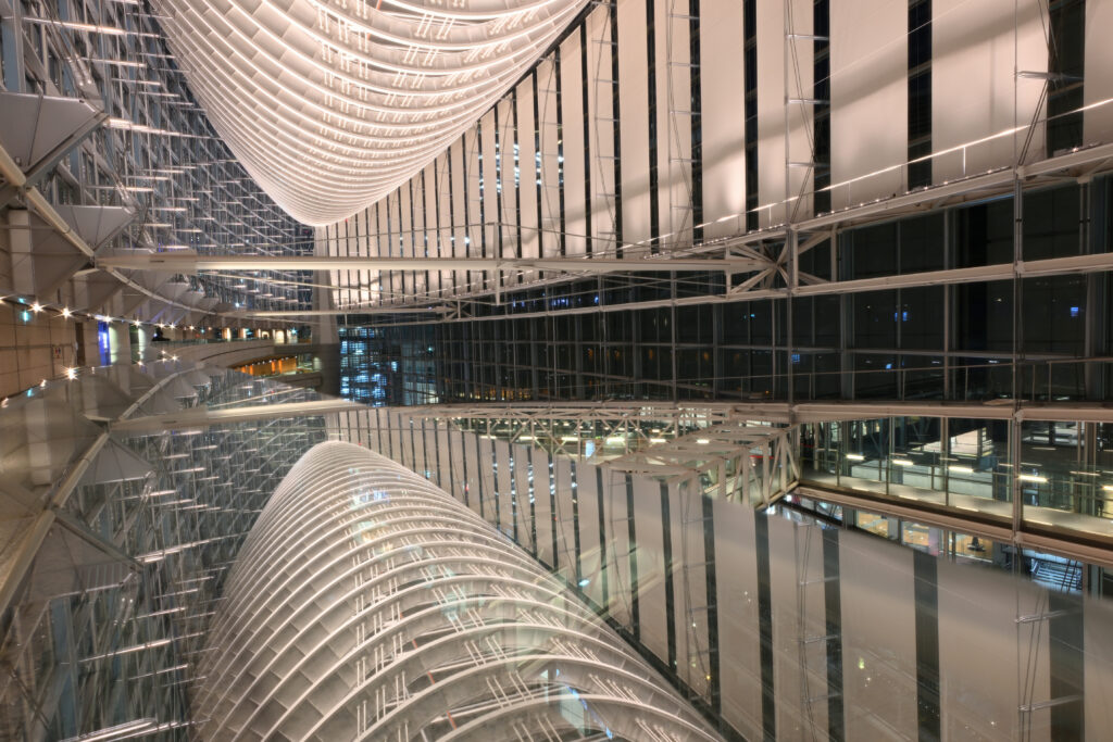 - 東京国際フォーラムのガラス棟の最上階です。手すりのガラス面に写り込んだ天井の造形物をC-PL+ R-Twinkle Star 6Xを重ねてC-PL効果が最大になる様にして撮影。