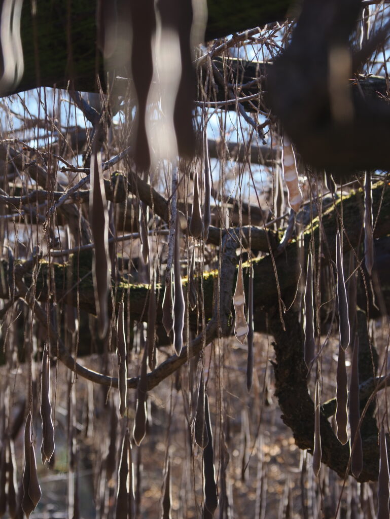 逆光に照らされた藤棚のシルエットがまるで自然が織りなすレースのカーテンのようでした。ブラックミストno5を使用して藤鞘のハイライトとシャドウ部が柔らかく描かれるように撮影しました。背景の冬枯れの木々とのコントラストも美しく表現されました。