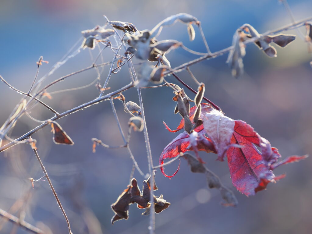 「冬の朝、世界は白い吐息をまとい、ひとひらの赤が静かに語りかけてきた。」柔らかな光のにじみは、ホワイトミストフィルターの魔法。霜のきらめきと赤の葉のコントラストが、まるで夢の中の風景のようでした。