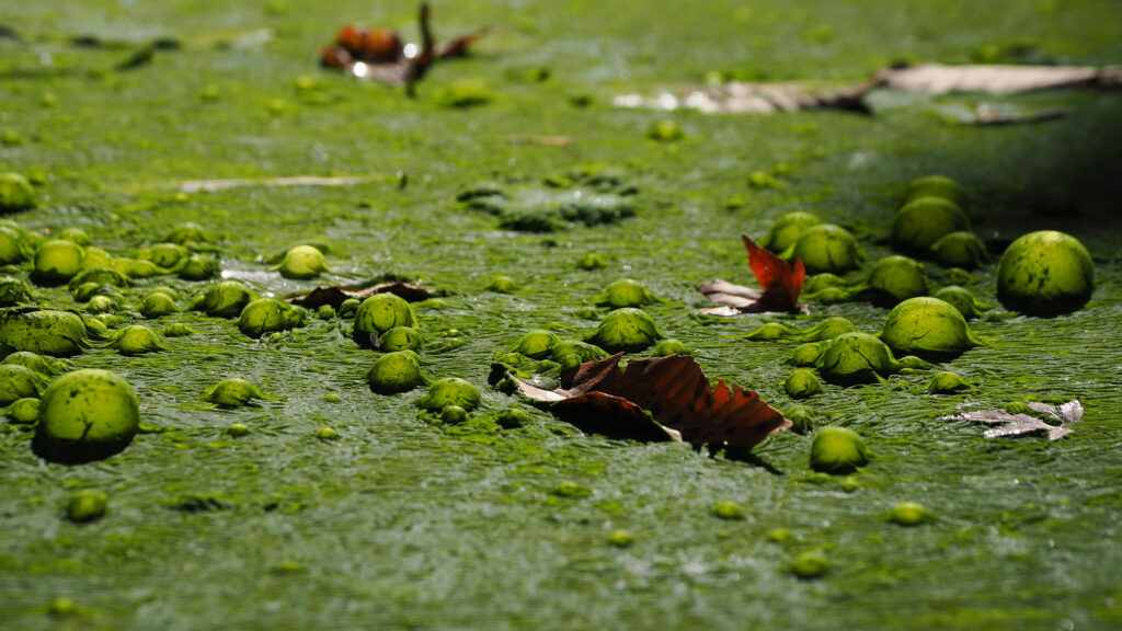 「PLフィルターを回しながら、藻の緑が最も深く、鮮やかに浮かび上がる瞬間を探しました。泡のドームはまるで異星の基地群のように水面に現れ、自然が描いたひとつの惑星のようでした。」