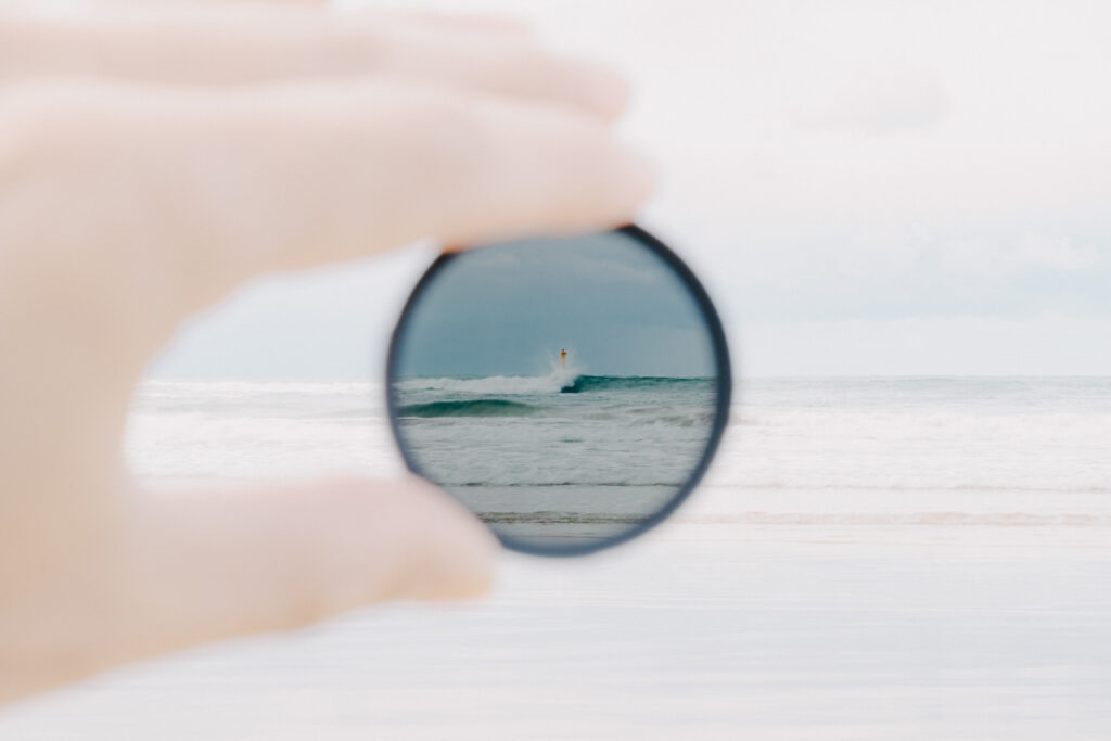 太陽が真上に昇ったころの冬の海にて、フィルターを飛び道具のように使用して撮影しました。カメラ側は全体が白く霞み、ぎりぎり何が写っているか分かるくらいの設定とし、画角内にNDフィルターを手持ちでかざして中心に適正露出を作りました。更に、カメラのレンズ径よりも小さいフィルタ径のNDフィルタを使用することで、視線誘導を促しました。