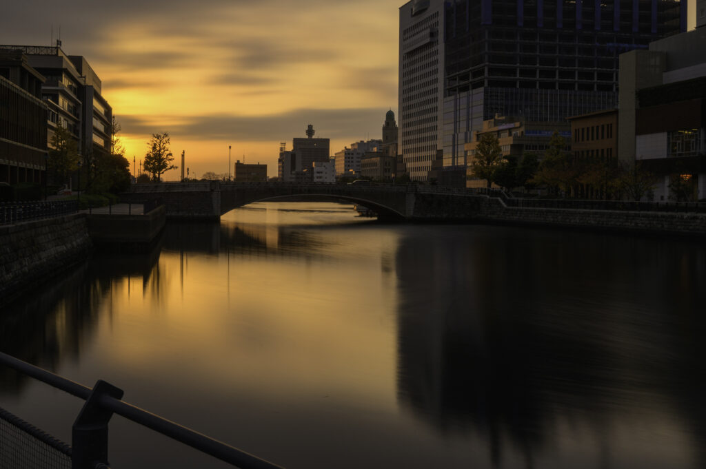 都市が目覚める、薄明の空と街並みを捉えました。NDフイルターを使用し、長秒間露光を行うことで、川面のさざなみを完全に消し去り、シルクのような滑らかになり、肉眼で見ることのできない、時が止まったかのような世界を表現しました。フイルターワークによってのみ実現できる、光と時間の蓄積を表現した一枚です。