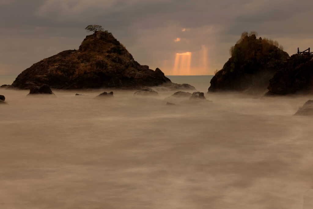 目の前の波打つ海水を雲海のように表現すること そして沖合の木漏れ日を映すため NDフィルターと低速シャッターで表現しました。