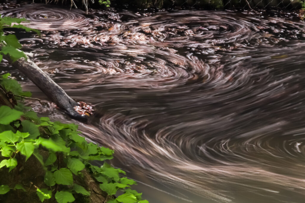 桜の散った後湖面に浮かぶ桜の花びらが渦を巻いて美しいぴんく色の弧を描いて流れていました。