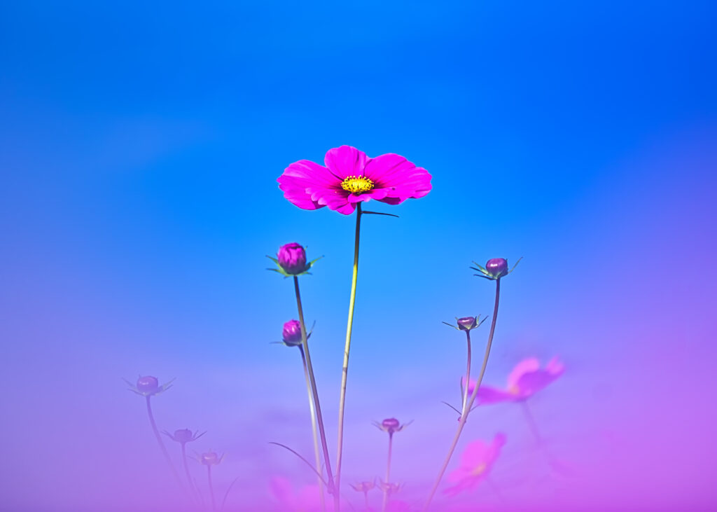 コスモスの撮影です、青空をバックに、澄み切った朝の清々しい空気のなか気持ちよく太陽を浴びているコスモスを周りをぼかし花をシャープにクッキリと撮影したいと思い撮影した私のお気に入りの一枚です。
