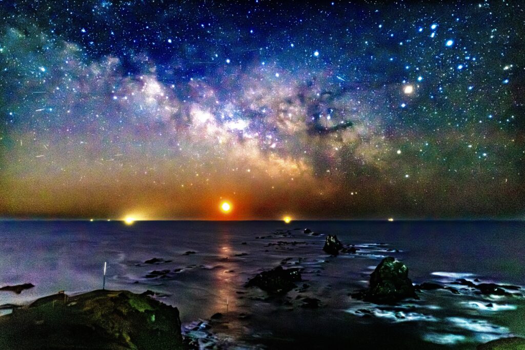 夜の襟裳岬に立ち、水平線から昇る月と天の川が重なる瞬間を捉えました。漆黒の海に映る光、静かに砕ける波音、そして頭上いっぱいに広がる無数の星々。人の営みを遠く離れたこの場所では、宇宙と大地が溶け合うような感覚に包まれます。小さな自分を実感しながら、永遠にも思える一夜の輝きをシャッターに刻みました。