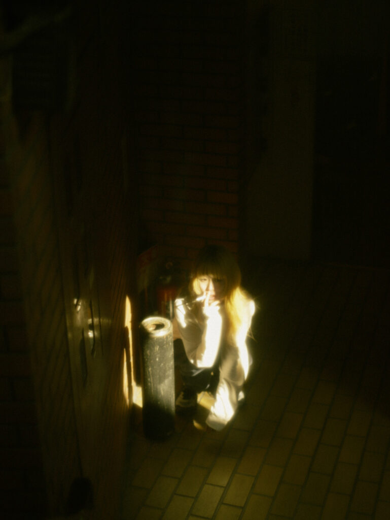 直射日光の強いコントラストをあえて抑えず、ホワイトミストフィルターを使用することで、ハイライト部分を柔らかく拡散させています。モデルを光の中に配置することで、日常的な風景をどこか映画のワンシーンのような、幻想的な質感に仕上げることを狙いました。