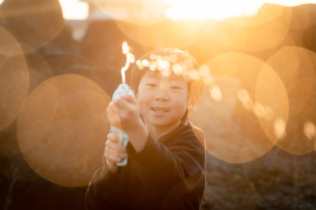 幻想的な夕方の水鉄砲と子供の笑顔をノスタルジックに撮影したかったのでブラックミストを使用して撮りました。