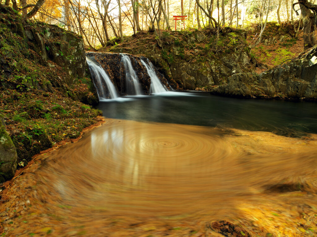 滝壺で生まれる渦の回転を長時間露光で捉え、肉眼では見えない円環の軌跡を浮かび上がらせた。