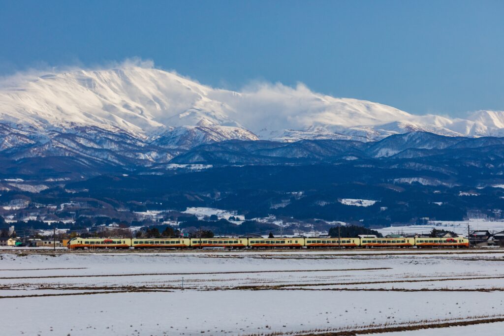 山形県のほぼ中央に位置する霊峰「月山」。庄内平野から山容全体がが確認できる晴渡った貴重な一日で特急「いなほ」と絡めての一枚です。地上は風もなかったですが、山頂付近は強風のようで、これも貴重な雪煙が確認できました。C-PL使用でしたが、雲がなかったのがちょっと残念でした。