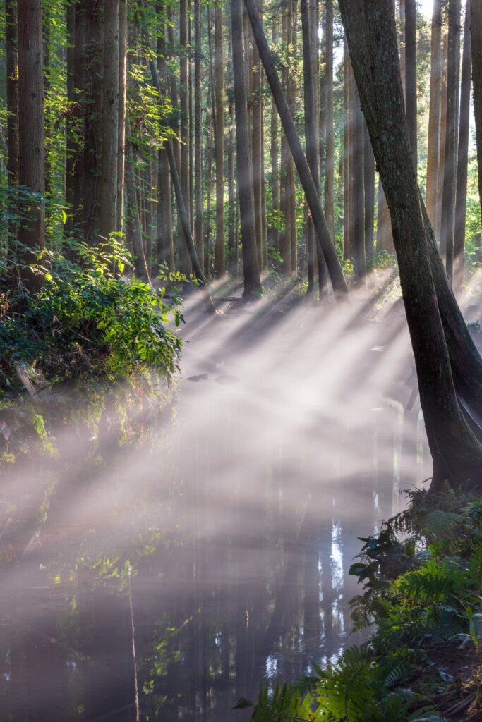山形県遊佐町「牛渡川」。鳥海山の伏流水100%の流れが、朝日に触れると川霧となって幻想的なシーンを観せてくれる場所です。この日は、前日に雨だったのでスギ林の中にも光芒が発生しより効果が増してくれました。