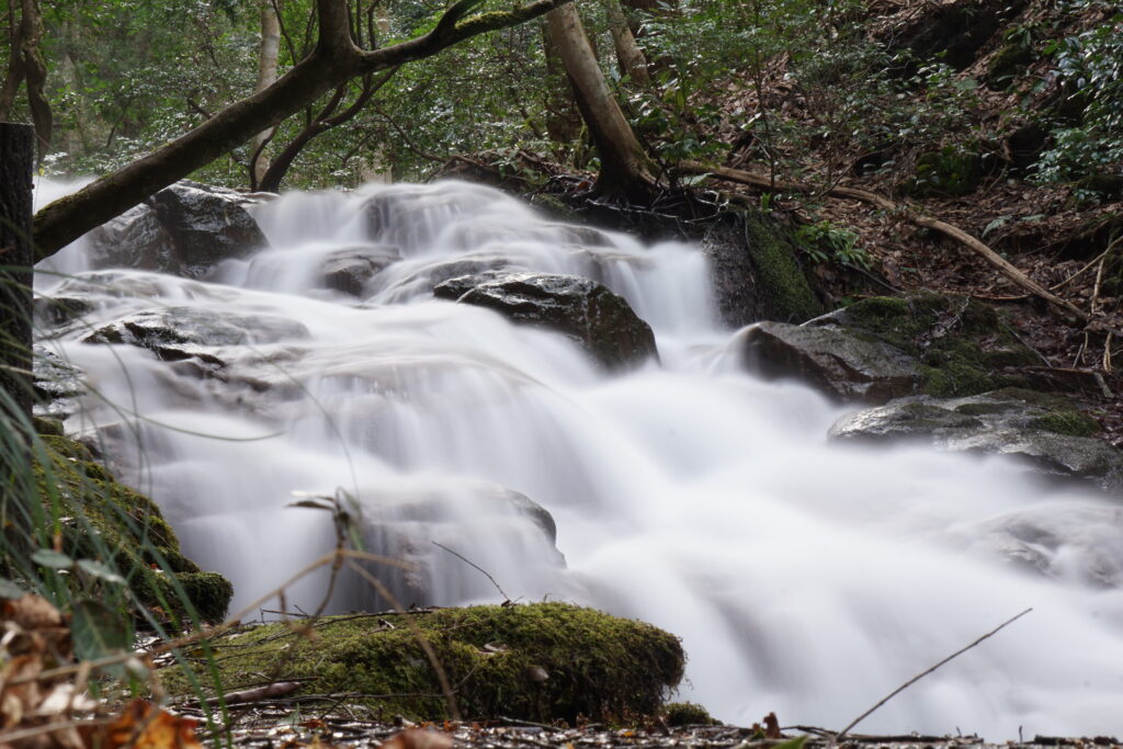 散歩道も終わりにちかずき、缶コーヒーも飲み終えて、最後の一口、缶コーヒーのキャップを三脚がわりに滝の階段を登り終えた頂上に静かに置き長時間露光、8秒に設定して