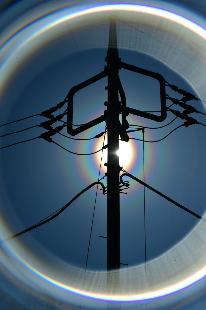 この日は、花粉の飛散が多く太陽の周りにハロがでており、ここぞとばかりにレインボーハロフィルターを付けて効果を強調して撮影しました。不思議な形の電柱をロケットに見立てて、電線が燃料供給ケーブルとしてスタンバイ完了です。