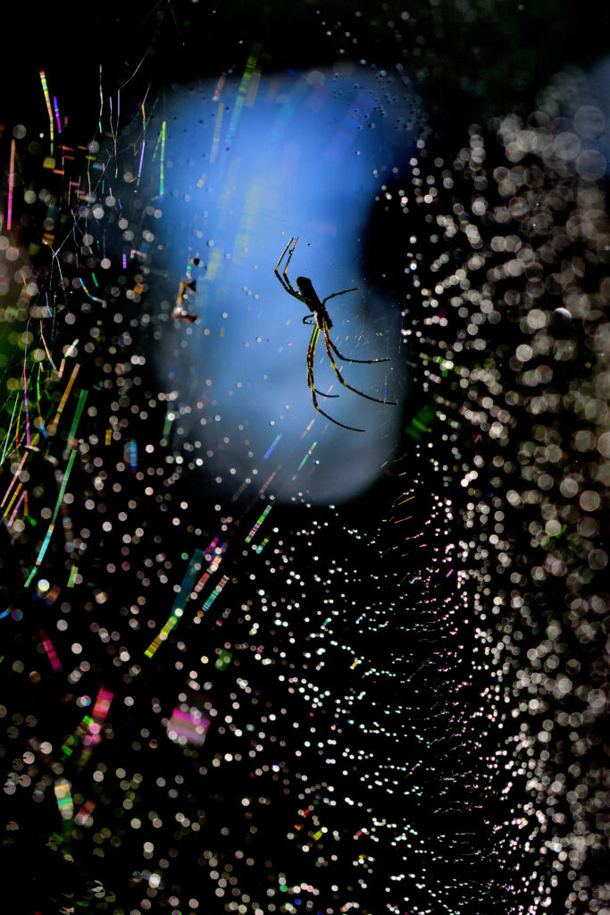 雨上がりの朝、普段見えにくいクモの巣も今朝は水滴で一面被われて朝日に輝いて光っている。巣の中央にいる蜘蛛に視点を合わせると周辺の水滴が玉ボケとなり虹色が出る。