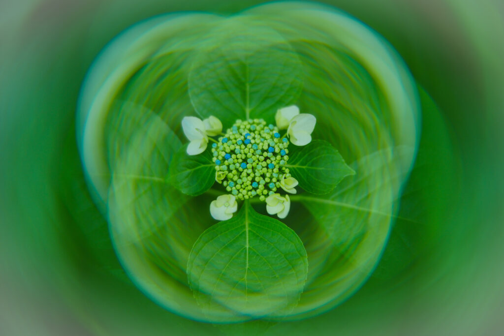 小さな額紫陽花をレインボーハロの効果で幻想的の表現してみました。