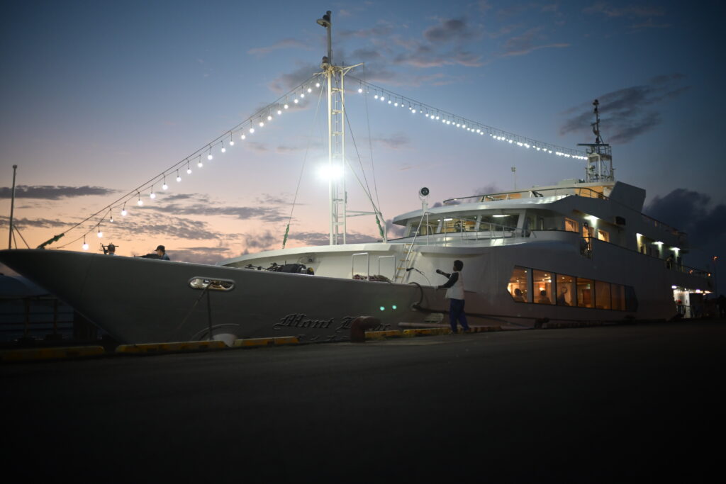 宮古島のベイクルーズ船 MontBlancが接岸する様子。Kenko WHITE MIST No1を使用。トワイライトタイムの空に船の光が柔らかく幻想的に描写されて、絵画的な雰囲気に。
