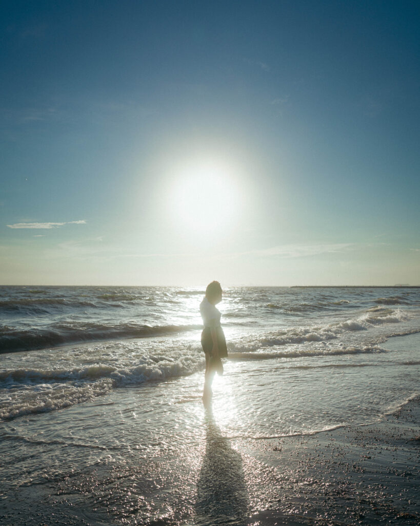 夕焼けの海辺で、強い逆光の中、制服姿のシルエットを捉えました。ブラックミストフィルターによる柔らかな光のにじみを生かし、夕暮れの余韻と静かな放課後の空気感を表現しました。