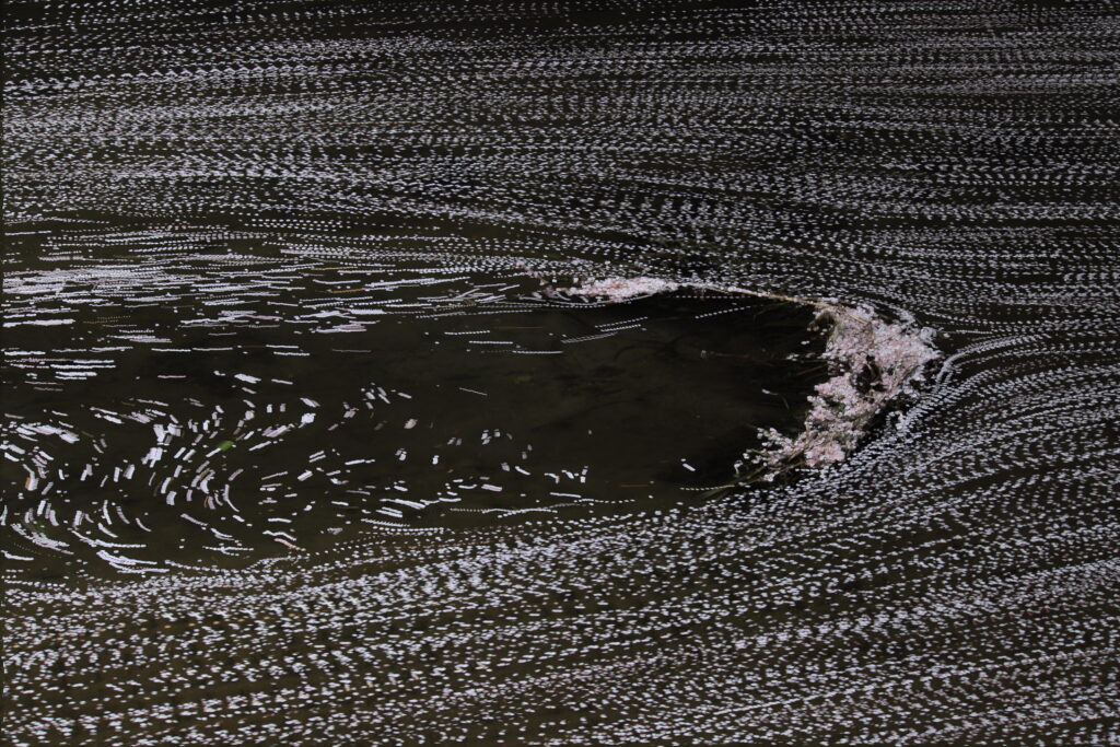 PLフィルターを使用して水面の反射を除去し、五条川を流れる花びらを撮影、比較明合成しました。