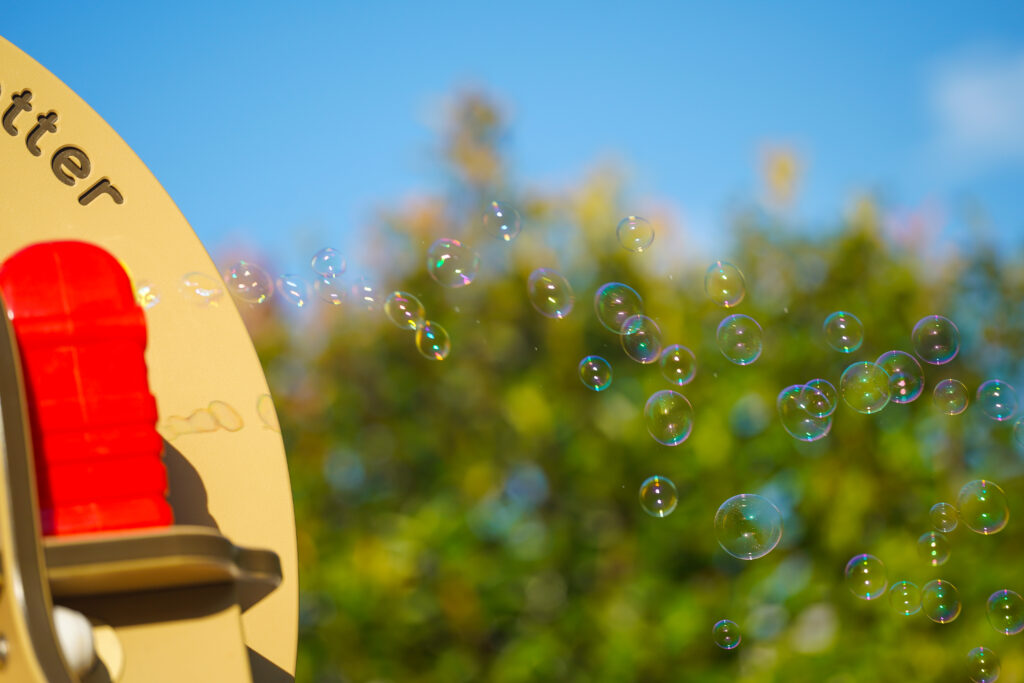 - 青空としゃぼん玉の組み合わせを撮りたいと思い、虹色の艶やかな色がくっきり写るようにゼクロスC-PLフィルターを使用しました。そして、しゃぼん玉に光があたった時、柔らかい雰囲気になるようブラックミストプロテクターを使用しました。逆光と順光で撮り比べて、順光の方が艶やかな虹色のしゃぼん玉がくっきり写りました。場所は家のそばの遊具がある公園で、遊具にしゃぼん玉機を置いて撮影しました。背景の木々の葉が玉ボケになり、大パレードになりました。