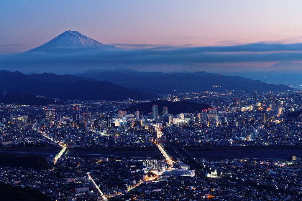 2025年の年末に朝鮮岩に登り撮影した冠雪富士と静岡市です。上下で光量が全く違う景色を1枚におさめるために輝く街の下半分にハーフNDを当て、長時間露光で撮影。この時間に長時間露光で撮影出来るのは6枚程度が限界。極力、白飛びしないよう露光時間を調整しながら撮影しました。