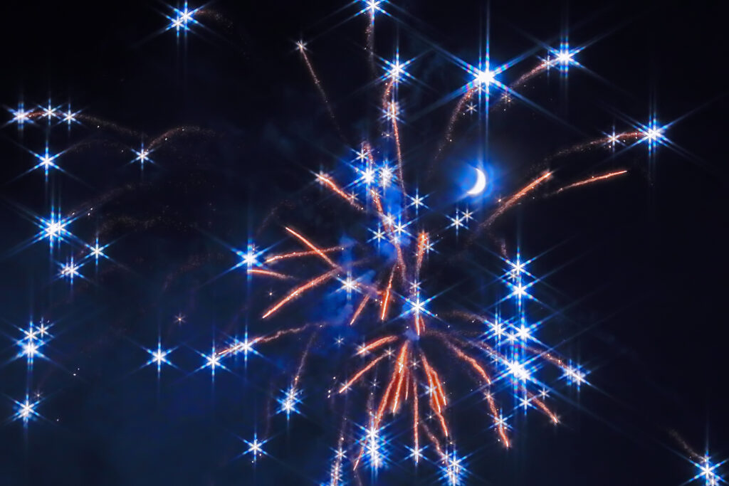 打ち上げ花火の中に見える月をアップで写した写真です。